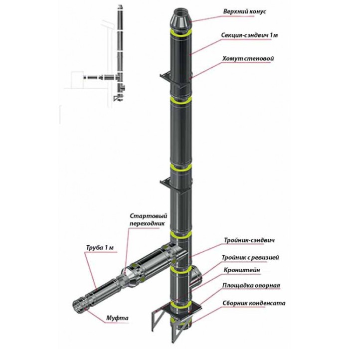 Даний комплект показаний як приклад, димохід розраховується під кожну потужність котла, та з урахування особливостей монтажу.