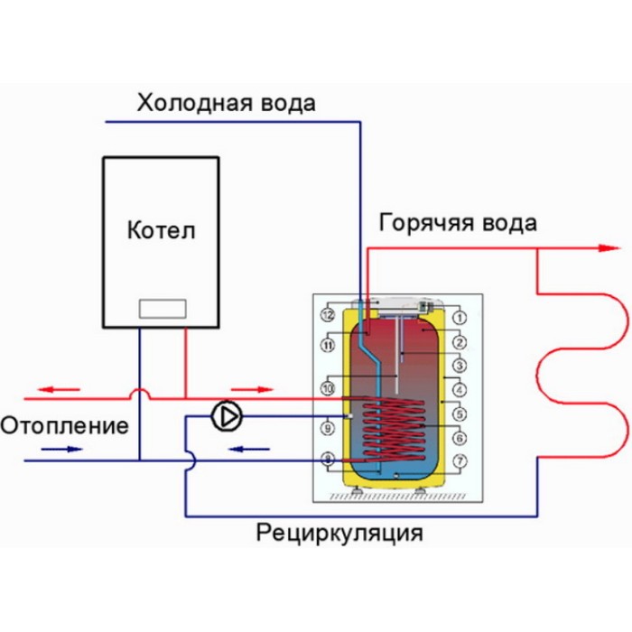 У бойлері непрямого нагріву вода гріється від трубки-змійовика, в якому циркулює теплоносій із системи опалення. Його температура в межах 50 – 70 градусів і він в самому бойлері розігріває воду до температури 40 - 60 градусів, саме те що потрібно для подачі в кран.