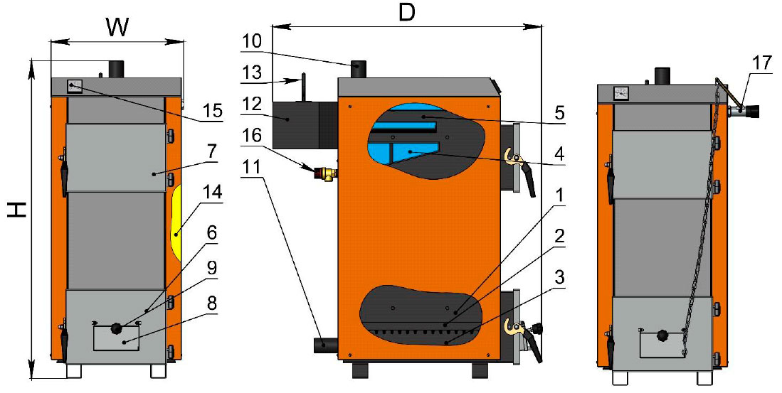 1 - топка; 2 - чавунне колосникове риштування; 3 – зольник; 4 – водна ємність; 5 – конвективний газохід; 6 – двері зольника та обслуговування колосників; 7 – двері топки; 8 – повітряна заслінка; 9 – регулювальний гвинт; 10 – патрубок прямої подачі води; 11 – патрубок зворотної подачі води; 12 – патрубок димоходу; 13 – шибер; 14 – теплоізоляція; 15 – термометр; 16 – запобіжний клапан; 17 – механічний регулятор потужності (монтується при встановленні котла).