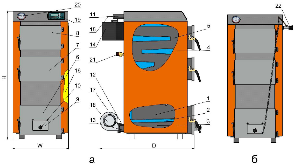 1 - топка; 2 - водне колосникове риштування; 3 – зольник; 4 – водна ємність; 5 – конвективний газохід; 6 – двері зольника та обслуговування колосників; 7 – двері топки; 8 – двері газоходу; 9 – повітряна заслінка; 10 – регулювальний гвинт; 11 – патрубок прямої подачі води; 12 – патрубок зворотної подачі води; 13 – патрубок зливу; 14 – патрубок димоходу; 15 – шибер; 16 – теплоізоляція; 17 – патрубок вентилятора; 18 – вентилятор; 19 – блок керування; 20 – термоманометр; 21 – запобіжний клапан; 22 – механічний регулятор потужності (монтується при встановленні котла).