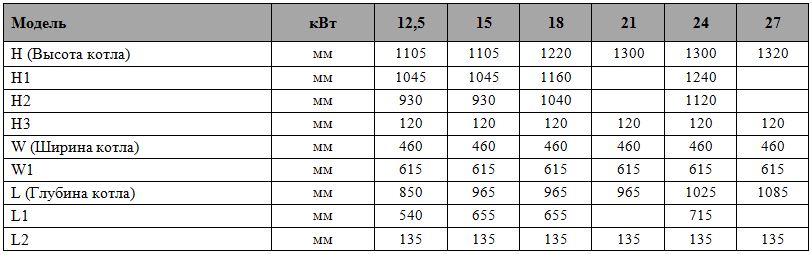 | Модель котла | КМ-12,5 | КМ-15 | КМ-18 | КМ-21 | КМ-24 | КМ-27 | |
